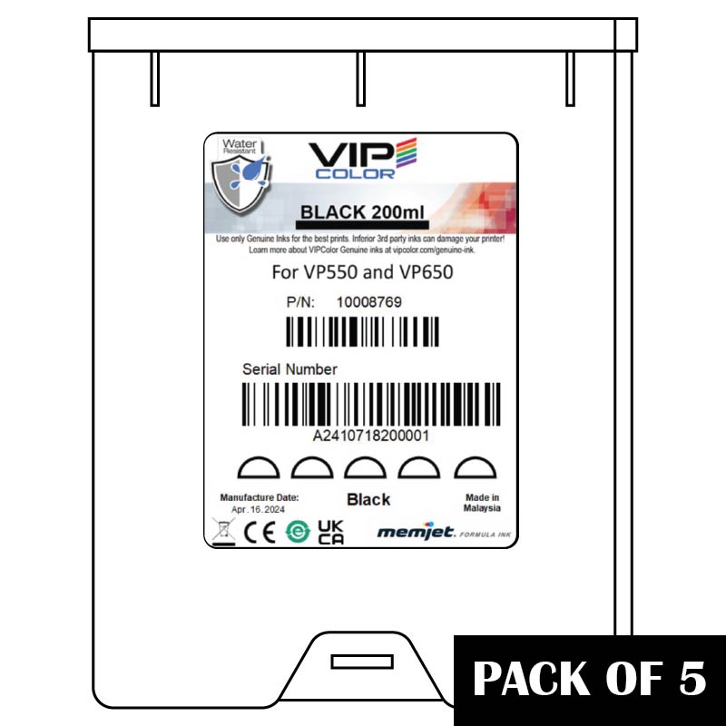 Black ink cartridges (200ml) for VIPColor VP550 and VP660. Sold in a box of 5 ink cartridges