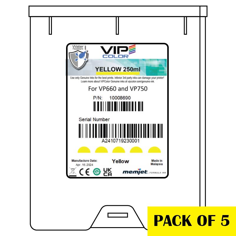 Yellow ink cartridges (250ml) for VIPColor VP660 and VP750. Sold in a box of 5 ink cartridges